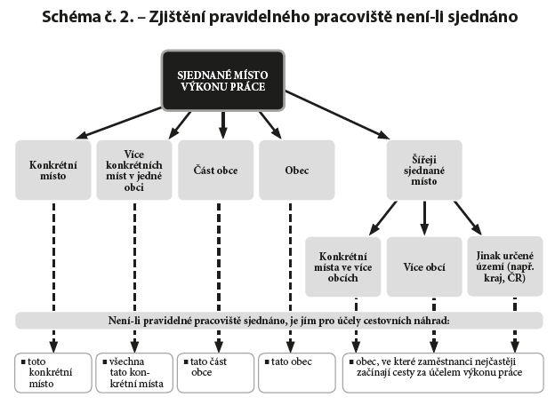 Jak se zjistí pravidelné pracoviště pro účely cestovních náhrad, není-li v pracovní smlouvě sjednáno, je uvedeno ve schématu č. 2.